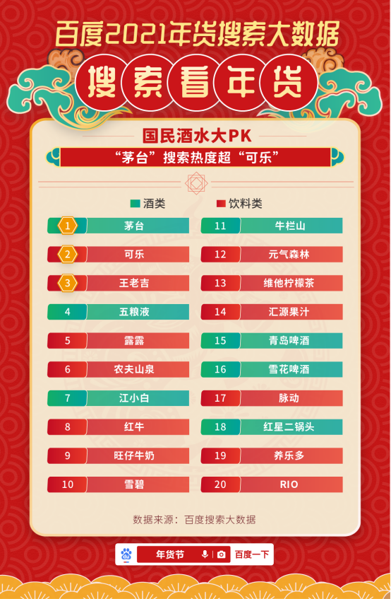 具体到酒水采购上,茅台略胜一筹,高于可乐,成为今年搜索关注最多的酒水类年货。中国人对茅台的爱,不仅体现在投资理财,还落实到买它、喝它的具体行动上。