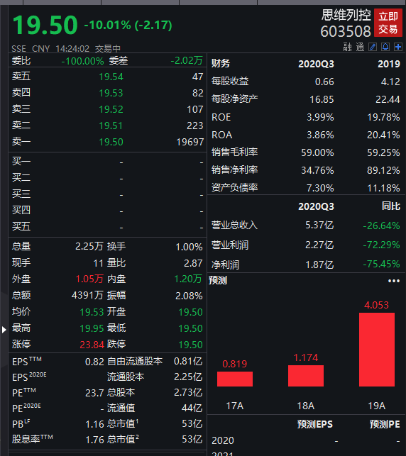 1月29日,思维列控股票开盘跌停,最新市值为53.1亿元,较前一日下跌近6亿元。