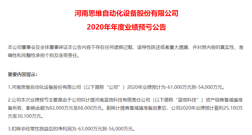 【大河报·大河财立方】(记者 王磊彬)1月28日,A股上市公司河南思维自动化设备股份有限公司(以下简称思维列控)发布业绩预告,2020年净利润预计亏损5.4亿元~6.1亿元,与2019年盈利7.89亿元相比,净利润巨亏。