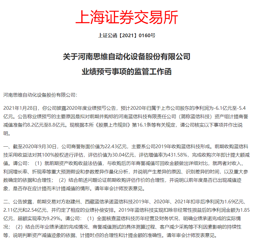 对于思维列控的计提商誉减值,上交所连夜下发监管函,要求其就相关情况进行说明。1月29日,思维列控股票开盘跌停,市值较前一日蒸发近6亿元。