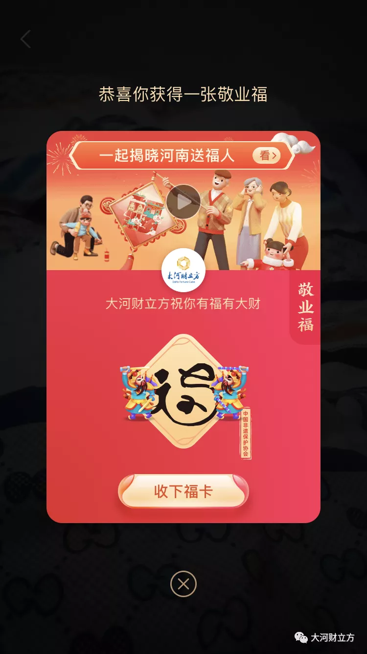 要想在2月1日00:00 至2月11日22:00期间额外领福卡,就来下载大河财立方App。从2月1日期,任何用户打开大河财立方App后,点击开机页或首页腰封广告区,即可进入大河财立方App专属领福卡页面,点击“开福气盲盒”并输入手机号、验证码,即可立即额外领取一张福卡,提升拿到“敬业福”的几率。