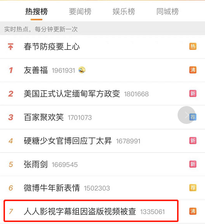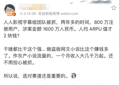 而今天2月3日,一大“噩耗”传来,人人影视字幕组因盗版视频被查,涉案金额超1600万元,14人被抓。