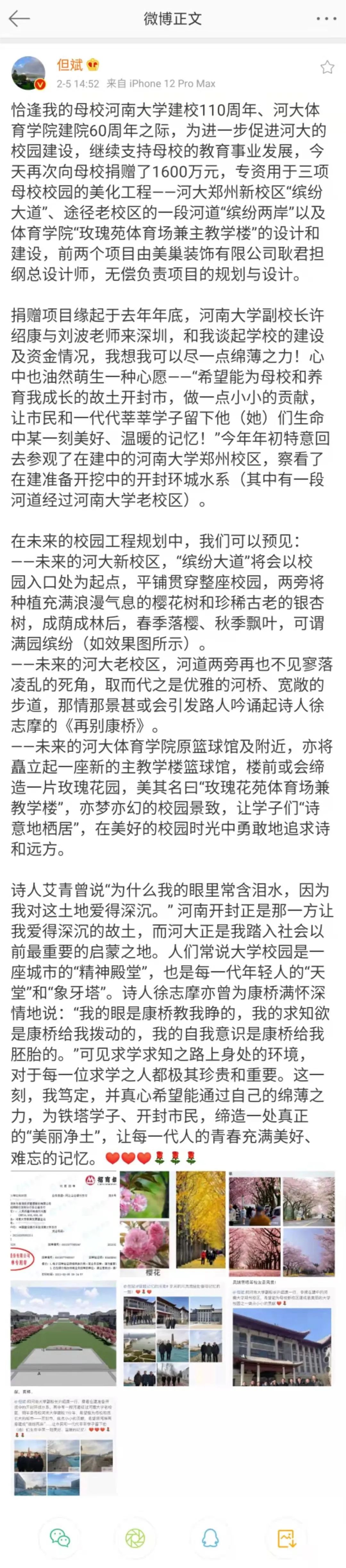 【大河财立方消息】2月5日,私募投资人、深圳东方港湾投资管理股份有限公司董事长但斌微博称,其向河南大学教育发展基金会捐赠1600万元,专资用于三项母校校园的美化工程——河大郑州新校区“缤纷大道”、途径老校区的一段河道“缤纷两岸”以及体育学院“玫瑰苑体育场兼主教学楼”的设计和建设。