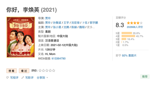 相比之下,《你好,李焕英》却出乎意料之外的迎来较好的口碑。大年初二开始,《你好,李焕英》的口碑牢牢占据热搜榜,豆瓣评分从8.1分升至8.3分,80%以上的网友给出了4星及以上的好评,“又笑又哭”、“后劲儿太大”成了许多观众的评价,有观众哭到口罩全湿,有人想立刻给家人打电话,有人说,想现在就冲回家。截至发稿,该片目前在豆瓣的实时评分仍为8.3分,成为本轮春节档七部影片中唯一突破8分的影片。