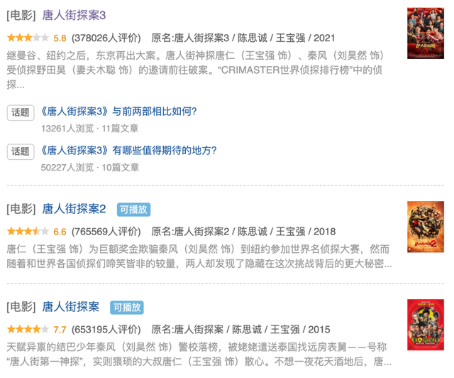 但《唐探3》在票房上迎来大丰收的同时,实时的豆瓣评分已跌至5.8分,远不及前作《唐探1》的7.7分和《唐探2》的6.6分: