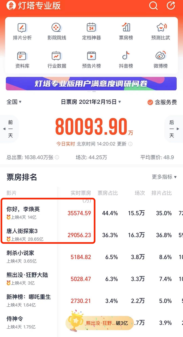 此外,根据灯塔专业版实时数据显示,今日《你好,李焕英》排片已上升至35%,与《唐探3》的36.8%已相差不多,而在排片落后的背景下,当日综合票房已经反超《唐探3》: