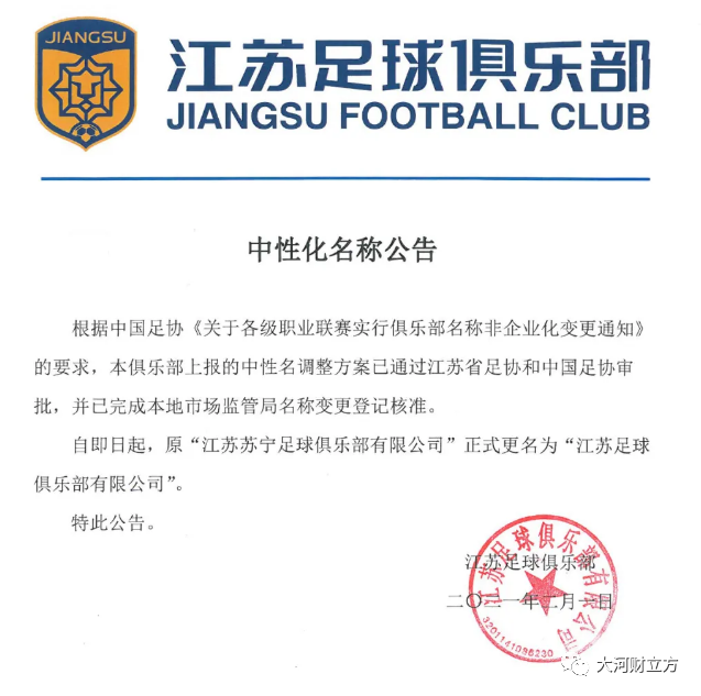 随后,2月1日下午,原中超江苏苏宁俱乐部通过官方渠道正式宣布,俱乐部已经正式更名为“江苏足球俱乐部”,而印在俱乐部公告上的俱乐部队徽图案已经去掉原有的“SUNING(苏宁)”拼音字样。