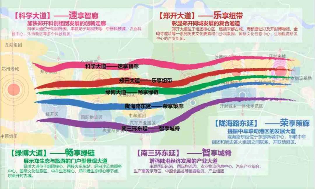 科学大道-速享智廊,郑开大道-乐享纽带,绿博大道-畅享绿链,陇海路东延-荣享策廊,南三环东延-智享城脊……近两天,一份落款日期为2021年2月的《郑开同城快速通道研究汇报》(以下简称《汇报》)文件流传开来,由于其中有郑开之间正研究的5条快速通道方案,很快引发多方关注和热议。