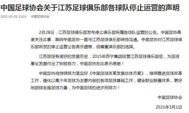 2月28日,江苏足球俱乐部发布停止俱乐部所属各球队运营的公告。中国足协高度关注此事,期间中国足协一直与江苏足球俱乐部保持沟通。中国足协对江苏足球俱乐部所发的停止运营公告表示遗憾,但尊重俱乐部的选择。