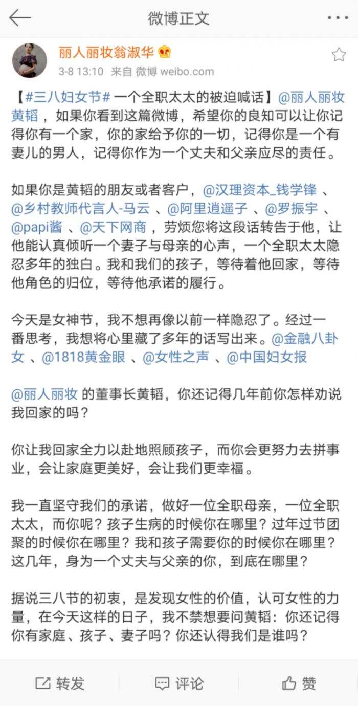 3月8日妇女节当天,帐号名为“丽人丽妆翁淑华”的微博用户发布长文,喊话丽人丽妆董事长黄韬履行家庭责任。该用户自称是黄韬妻子,简介为“我是翁淑华本人,丽人丽妆001号员工”。
