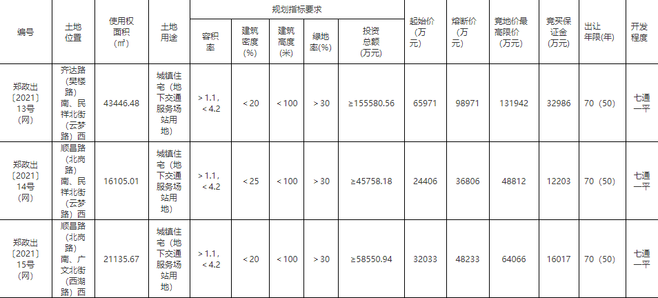地块编号郑政出〔2021〕13号(网),地块位于齐达路(樊楼路)南、民祥北街(云梦路)西,出让面积4.34万平,土地用途为城镇住宅(地下交通服务场站用地),起始价6.6亿元,熔断价9.9亿元。