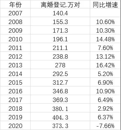在经过持续多年的上升之后,2020年离婚登记人数首次出现了下降,民政部数据显示,2020年我国离婚登记数据为373.3万对。