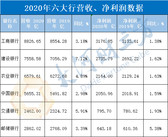 年报数据显示,2020年,六家国有大行普遍实现营业收入、净利润双双上升,不过增长幅度相比往年有所收窄。从营业收入增长幅度来看,六家国有大行增长幅度不一。