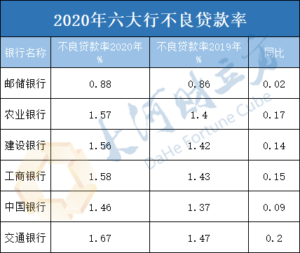而邮储银行仅上升0.02个百分点,2020年邮储银行不良贷款率为0.88%,是六大行中最低,也是六大行中不良贷款率唯一一家低于1%的国有大行。