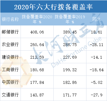 大河报·大河财立方记者注意到,2020年,六大行中只有邮储银行拨备覆盖率上升,而且邮储银行是六大行中拨备覆盖率最高的国有大行。2020年,邮储银行拨备覆盖率为408.06%,同比上升18.61个百分点。