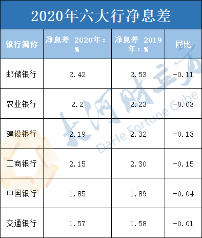 从绝对额来看,2020年年报数据显示,邮储银行净息差在六大行中居首位,2020年该指标为2.42%,同比下滑11个基点。