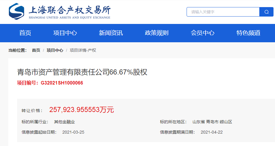 近日,上海联合产权交易所发布产权转让公告,青岛资产66.67%股权转让事宜正式浮出水面。