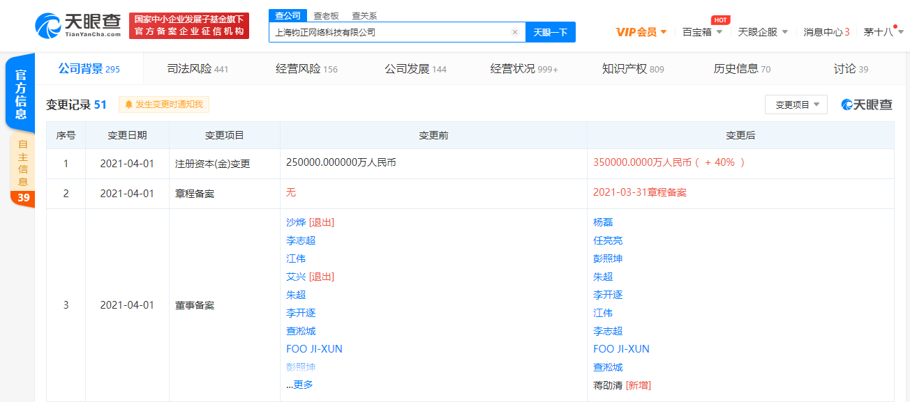 【大河财立方消息】天眼查App显示,4月1日,上海钧正网络科技有限公司发生工商变更,注册资本由25亿人民币增至35亿人民币,增幅达40%。此外,沙烨、艾兴退出高级管理人员行列,新增人员为蒋劭清。