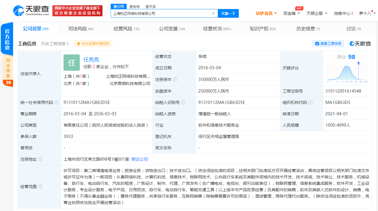 上海钧正网络科技有限公司成立于2016年3月,法定代表人为任亮亮,经营范围包括旅游业务、物联网管理、信息系统集成服务、自行车、电动自行车的租赁及其配件的销售;共享自行车服务等。股东信息显示,该公司由江苏哈啰普惠科技有限公司100%持股。