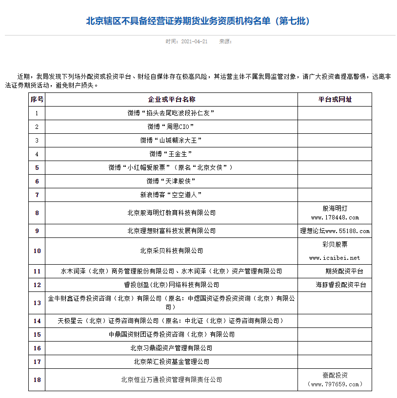 【大河财立方消息】4月21日,中国证监会北京监管局通报第七批《北京辖区不具备经营证券期货业务资质机构名单》。