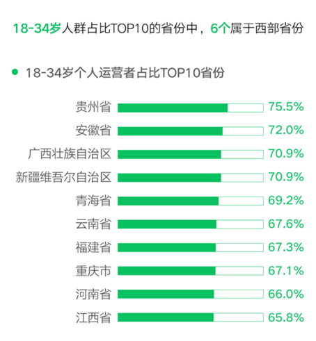借助视频号、微信公众号或订阅、小程序等工具,越来越多的年轻人发现了自己喜欢的创业方向或工作内容,在家或就近开启生意。比起年龄更大的就业者,年轻人更积极投身低线城市数字化发展。报告显示,微信生态产品个人运营者中,一线、二线、三线及以下城市,18~24岁人群占比呈现稳步提高的趋势。此外,18~34岁人群占比TOP10的省份中,6个属于西部省份,河南即是其一。