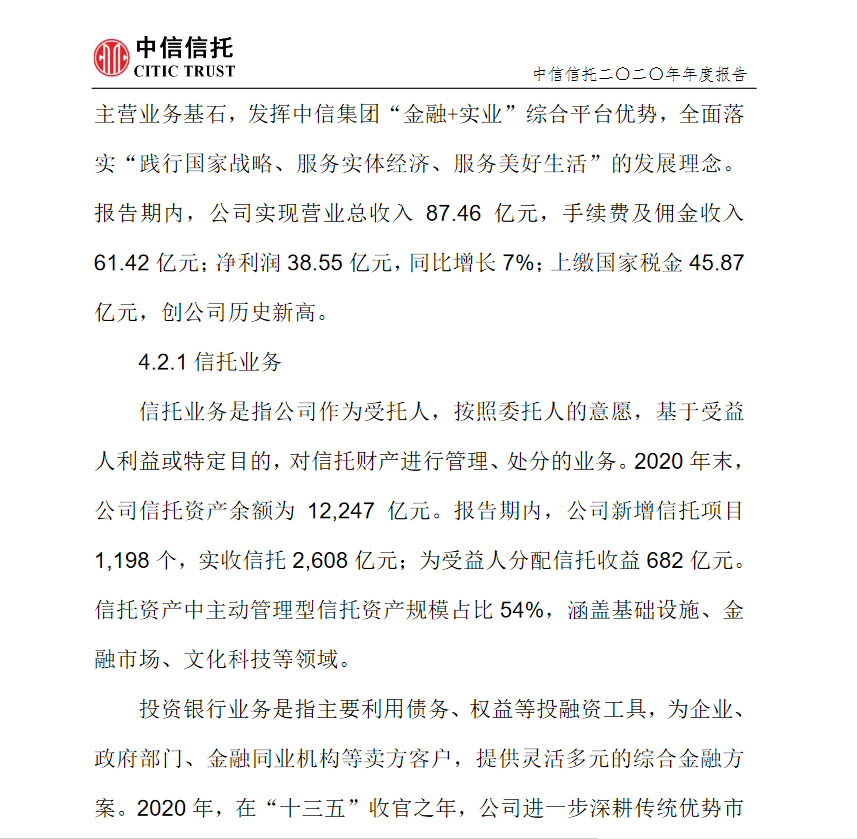4月26日,中信信托有限责任公司(以下简称中信信托)披露2020年年报,数据显示,2020年,中信信托实现营业总收入87.46亿元,其中信托业务收入61.42亿元,实现净利润38.55亿元,同比增长7.29%。