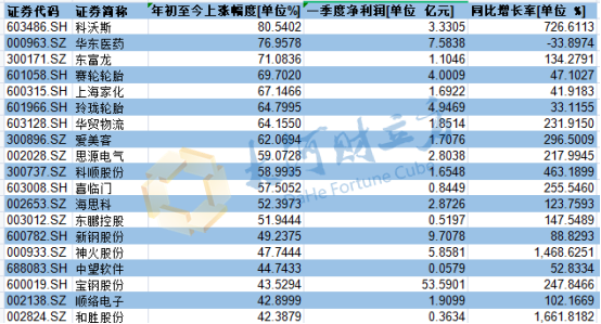 此外,赛轮轮胎、上海家化、玲珑轮胎、华贸物流、爱美客、思源电气等涨幅均在50%以上。
