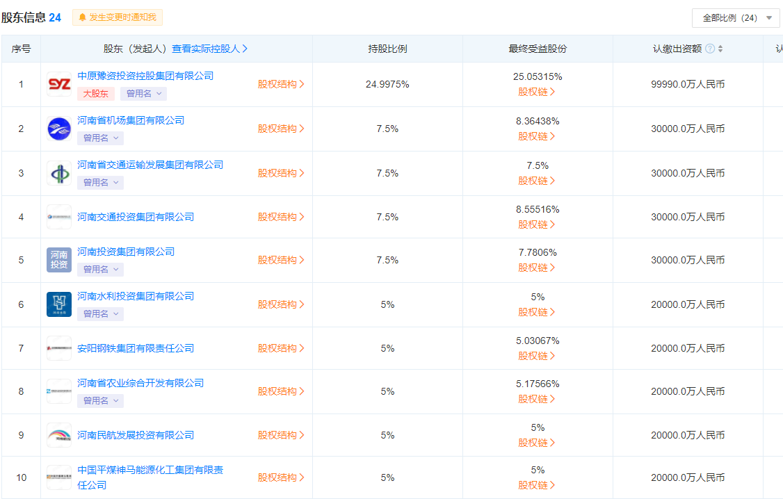 据天眼查APP显示,这只基金由中原豫资控股、河南省机场集团、河南交投集团、河南省交通运输发展集团、河南投资集团、河南水投集团、安阳钢铁集团、河南农开公司、河南省民航发展投资、平煤神马集团、河南能源化工集团、河南省铁路投资公司等23家省属国企设立,已于2021年4月25日注册完成,经营范围主要以私募基金从事股权投资、投资管理、资产管理等活动。