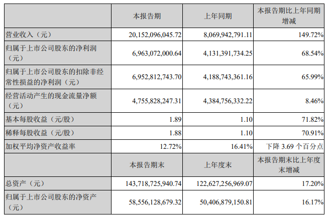 数据显示,一季度牧原股份归属于母公司所有者的净利润69.63亿元,同比增长68.54%;营业收入201.52亿元,同比增长149.72%;基本每股收益1.89元,同比增长71.82%。