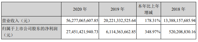 同日,牧原股份发布2020年年度报告。报告显示,牧原股份2020年营业收入为562.77亿元,同比增长178.31%;归属于上市公司股东的净利润为274.51亿元,同比增长348.97%。