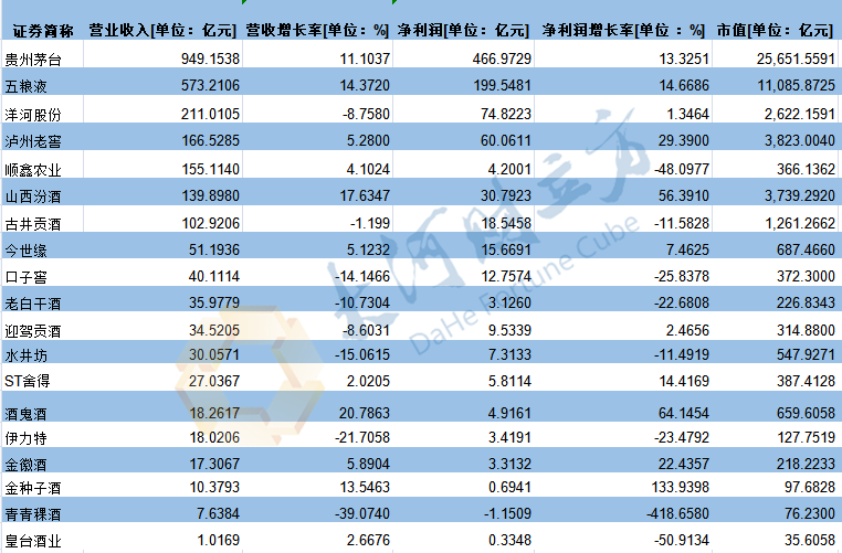 截至4月30日中午,中国19家代表性白酒上市公司年报已悉数披露完毕。贵州茅台、五粮液、洋河股份、泸州老窖、顺鑫农业、山西汾酒、古井贡酒7家企业营收超百亿元,今世缘、口子窖、老白干酒、水井坊等12家酒企营收达到30亿元以上。其中,贵州茅台营收、净利润、毛利率、市值等均位居全行业第一。