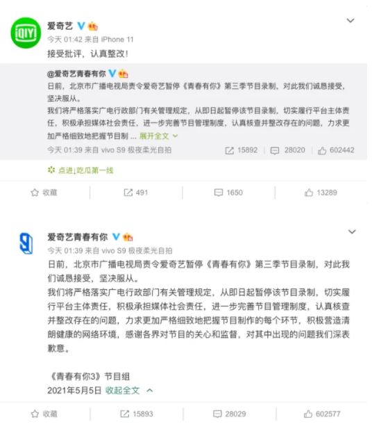5月5日凌晨,爱奇艺《青春有你》官方微博发文,对北京市广播电视局责令停播通知,诚恳接受,坚决服从。即日起暂停该节目录制,认真核查并整改存在的问题。随后,爱奇艺官方微博账号转发该条微博,并回应称,接受批评,认真整改。