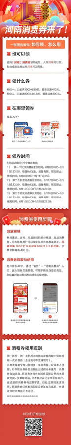 据了解,此次活动期间,京东将在河南省商务厅指导下在618期间针对河南省消费者发放超千万元的专属消费券。6月8日0时起,在河南的消费者可以通过京东APP河南消费券专题页或在京东APP搜索“河南消费券”即可领取消费券。领取用户购买京东平台指定的手机通讯、家电、电脑数码领域的热销产品,可在原有优惠基础上再享折扣,即满1000元享9折,优惠金额最高400元,或满800元享9.5折,最高优惠400元。