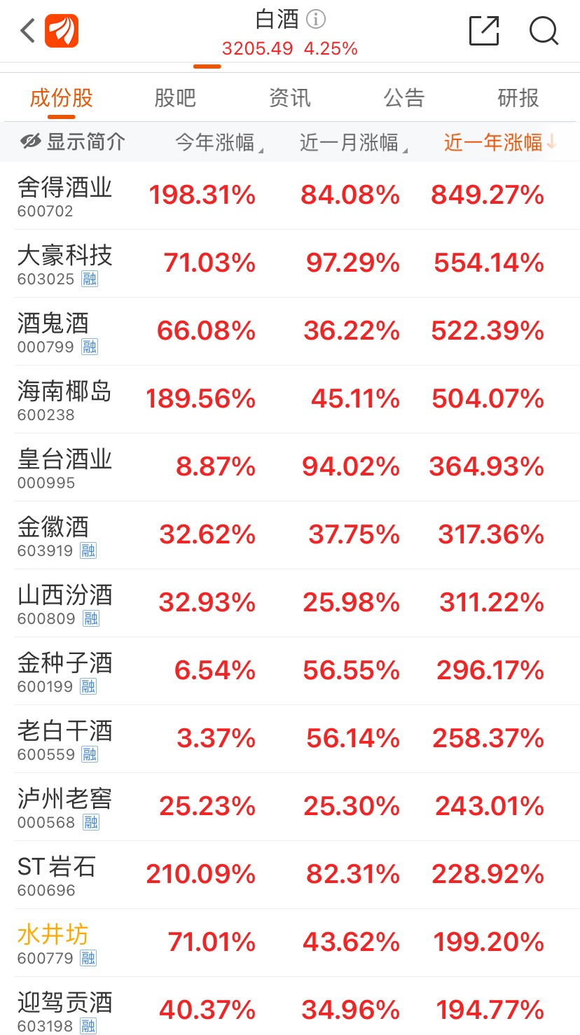 除了山西汾酒外,仅从股价上来看,舍得酒业的表现同样吸睛。Wind数据显示,舍得酒业已经连续6天保持上涨,目前总市值达到857亿元,该股票近一年涨幅高达849.27%。