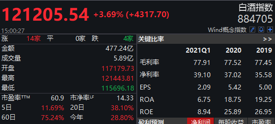 其中,贵州茅台2021年第一季度实现营业收入272.71亿元,同比增长11.74%,实现净利润139.54亿元,同比增长6.57%;五粮液发布第一季度报告实现营业收入243.25亿元,同比增长20.19%,实现净利润93.24亿元,同比增长21.02%。