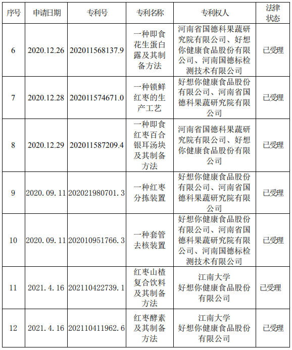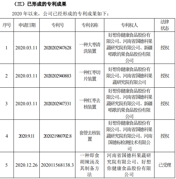 记者注意到,公告中对布局的原枣类、枣精深加工类、冻干产品类等常规进行了详细说明。据统计,2020年初至今共形成专利成果12项。