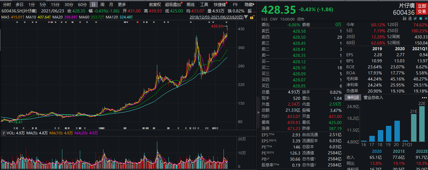 从2020年初,片仔癀股价就从100元,一直上涨至近期的439.93元,上涨了约3.4倍。截至6月23日收盘,片仔癀股价为428.35元,市值达到2584亿元。如今,片仔癀市值位居医药上市公司第六位,超过了复星医药、长春高新、云南白药等知名药企。