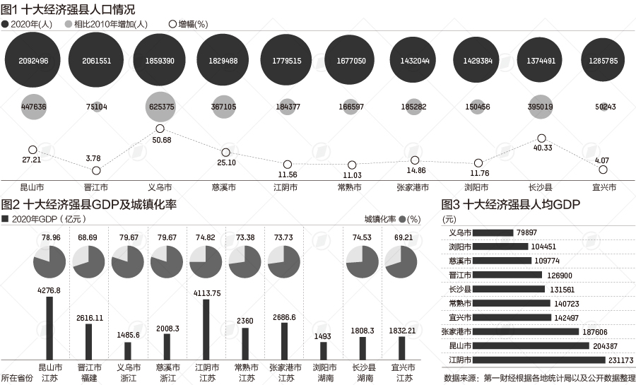 记者通过梳理2020年GDP十强县公布的七人普数据发现,经济十强县人口均超过了120万大关,其中昆山位居第一,达到209万人。十年来,义乌增量最大,增加了62.54万人,增长50.68%。
