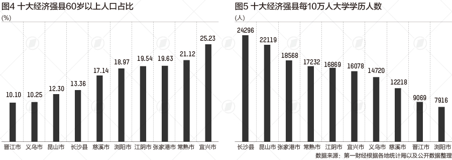 相比之下,在十强县中,位于苏南的几个强县老龄人口占比较高,其中宜兴市60岁及以上人口占比达到了25.23%,常熟市也达到了21.12%,张家港和江阴都超过了19%。丁长发说,苏南的这些经济发达县的城镇化比较早,城镇化率比较高,出生率一直比较低,老龄化程度比较高。