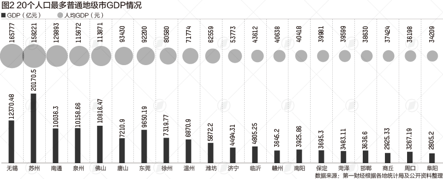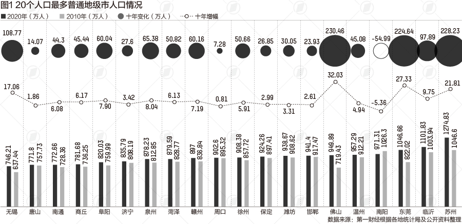 第一财经记者梳理第七次全国人口普查数据发现,常住人口前十名的普通地级市分别是苏州、临沂、东莞、南阳、温州、佛山、邯郸、潍坊、保定和徐州。其中,苏州、临沂和东莞三城超过了1000万大关。周口、赣州、菏泽、泉州、济宁、阜阳、商丘、南通、唐山和无锡居第11至20位。从这20个城市的人均GDP来看,无锡、苏州、南通位居前三。
