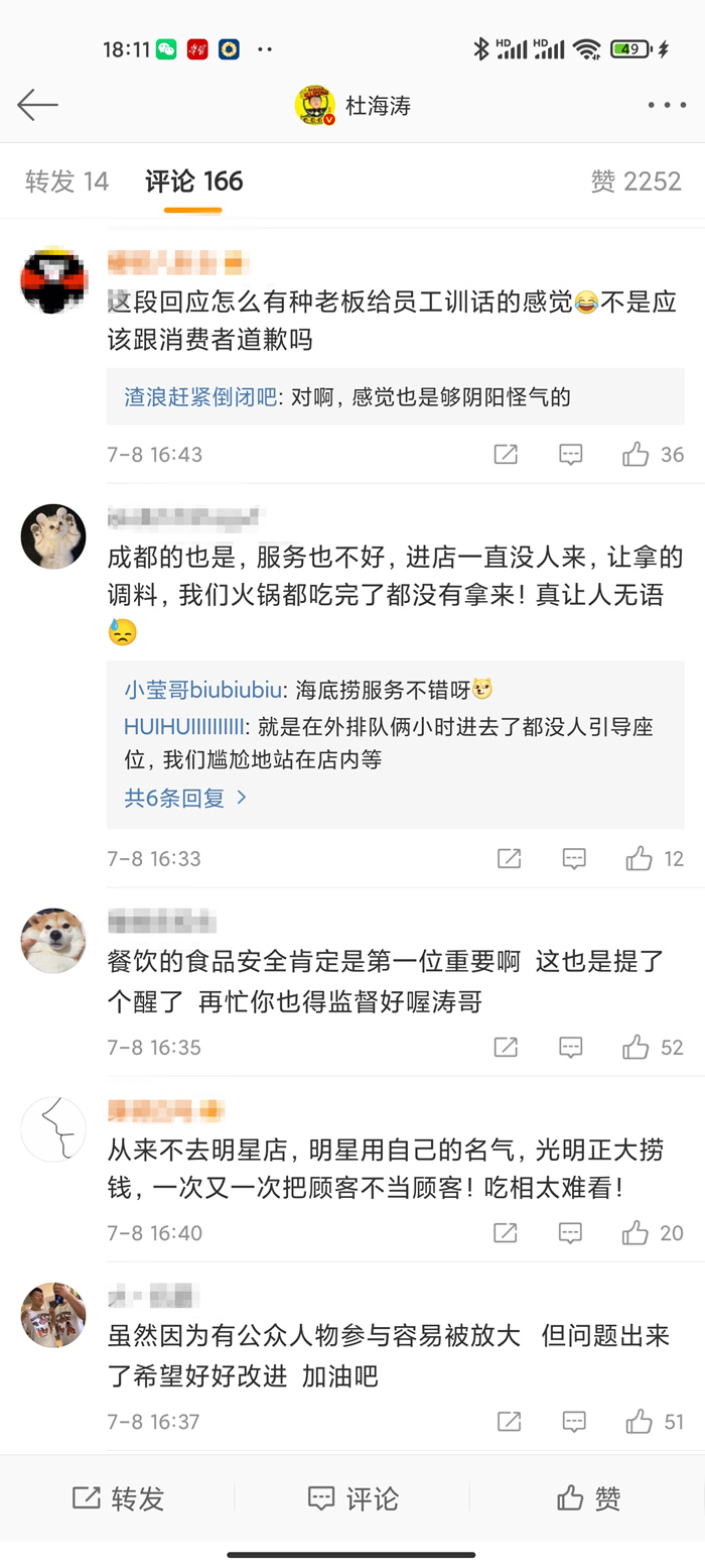 7月8日16时许,杜海涛转发了辣斗辣官方微博发布的道歉声明,并表示“有问题就要重视且彻底解决,积极跟进做好后续每个细节整改,每一家店必须要足够重视,做好自查自纠。”