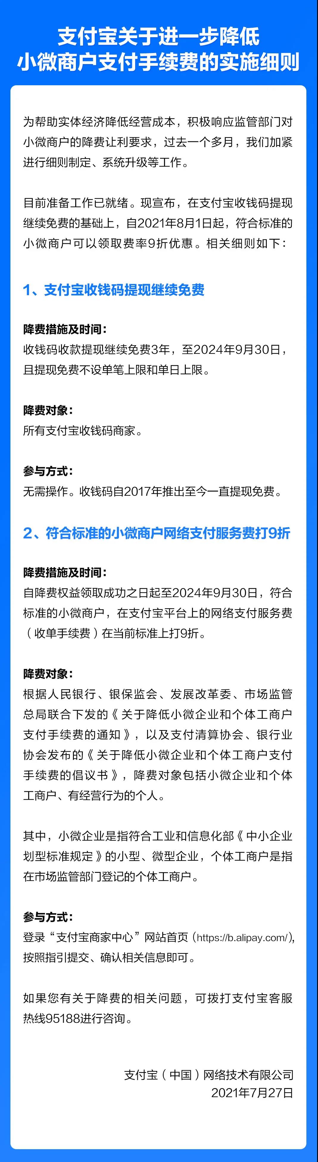 【大河财立方消息】7月27日下午,支付宝宣布对小微商户的降费细则,自8月1日起,符合条件的商家能领取费率9折的权益。