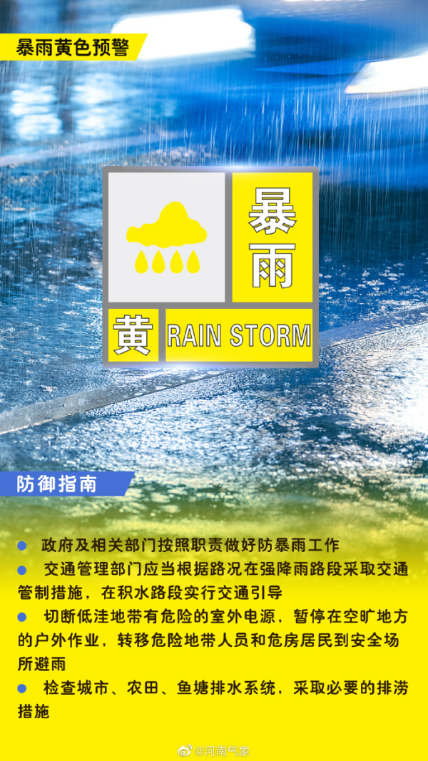 河南省气象台2021年08月05日06时00分发布暴雨黄色预警:预计未来6小时内,焦作地区和洛阳、新乡、安阳、鹤壁四地区西部及郑州西部北部部分地区降水量将达50毫米以上,局部达100毫米以上。