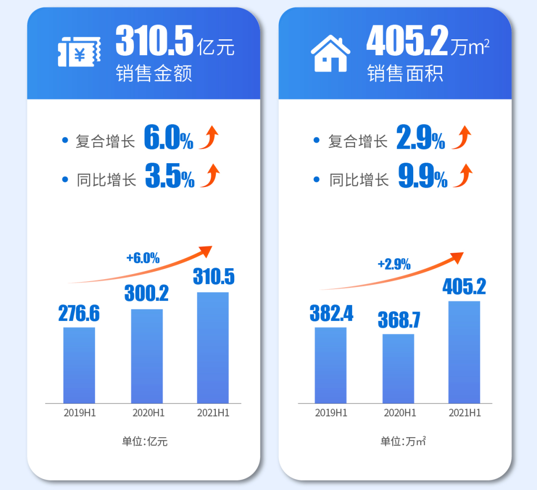 2021年上半年,建业地产在经营上持续突破,保持了稳步增长。其中销售金额达到310.5亿元,复合增长达6.0%,同比增长3.5%;销售面积405.2万平方米,复合增长2.9%,同比增长9.9%,成为河南区域房地产市场内销售金额与销售面积的“双料冠军”。
