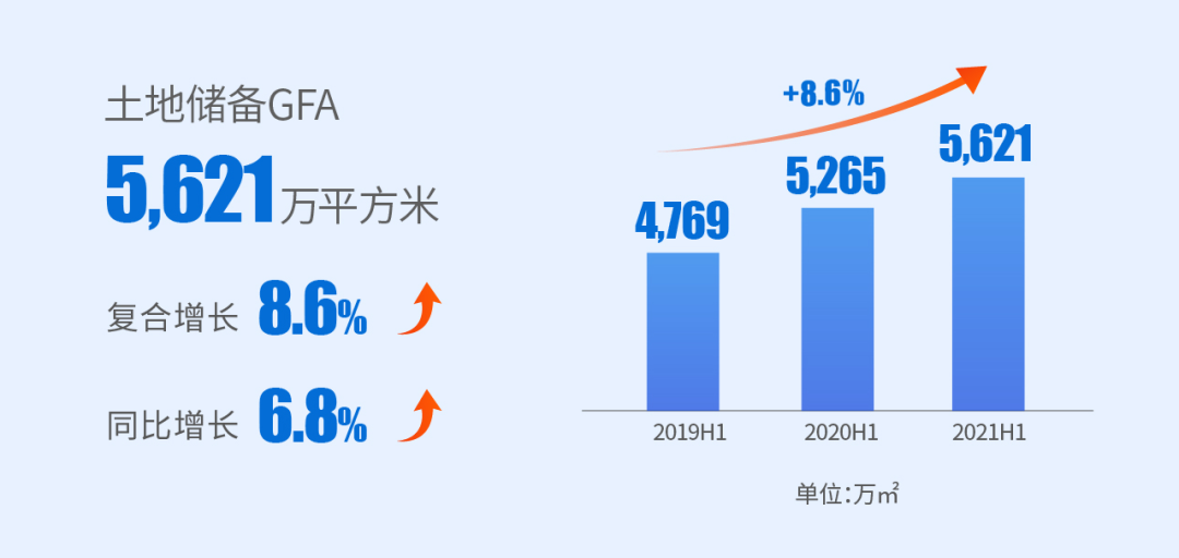 通过对区域内不同能级城市市场的统筹和分析,建业地产透过多种渠道,广泛拓展项目资源。报告期内,建业地产土地储备GFA为5621万平方米,复合增长率为8.6%,同比增长率达6.8%。通过合作、收购等拿地方式锁定优势资源,新增土地楼面价持续降低,预计未来总可售货值超2000亿元。