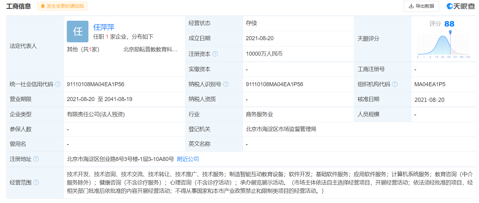 【大河财立方消息】天眼查App显示,近日,北京励耘普教教育科技有限公司成立,注册资本1亿人民币,法定代表人为任萍萍,经营范围包括制造智能互动教育设备;教育咨询;心理咨询等。