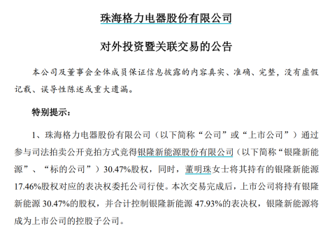 继董明珠个人持有银隆新能源17.46%的股权之后,8月31日,格力电器通过司法拍卖的方式竞得银隆新能源3.36亿股股份,占银隆新能源总股份的30.47%。