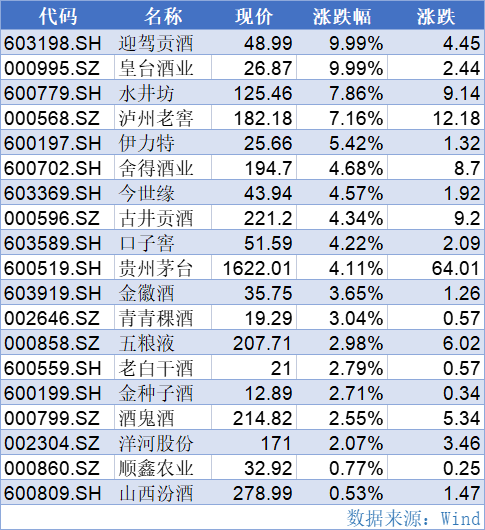 值得一提的是,当日贵州茅台报收1622.01元,涨幅4.11%;五粮液报收207.71元,涨幅2.98%;洋河股份报收171元,涨幅2.07%。