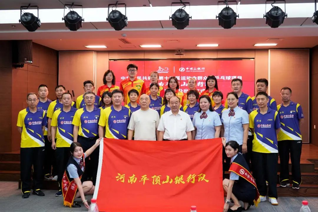 7月15日,在平顶山银行郑州分行,第十四届全国运动会群众组乒乓球项目预赛河南平顶山银行队冠名签约暨出征仪式举行,河南平顶山银行队队员正式出征北方赛区预赛。