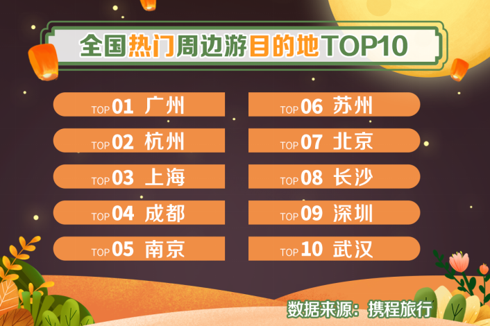 今年中秋,最热门的周边游目的地多数集中在华东、华南地区,Top10分别为:广州、杭州、上海、成都、南京、苏州、北京、长沙、深圳、武汉。